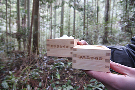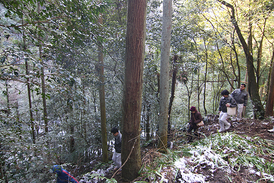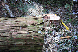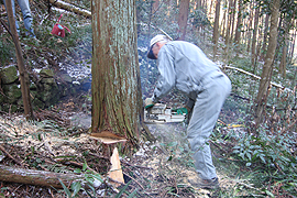 | 2010年初の大黒柱伐採イベントを開催しました。 数日前の寒波で積もった雪が残る仲南の山。木の家を計画中のKさんご家族の大黒柱になる桧を伐採しました。樹齢は80年超、目の詰まった良質な桧です。一番玉の大黒柱を含めて4〜5本の柱がとれそうです・・・。 大黒柱を伐ったご家族は今回で33組目になりました。 |