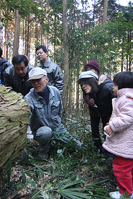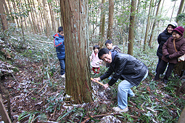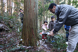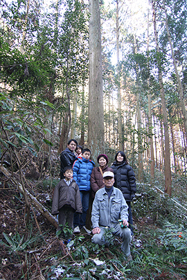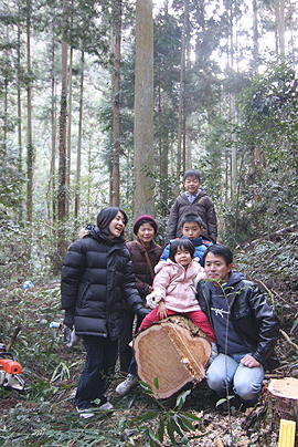 | この桧を切り倒します。ご家族で記念撮影です。 |