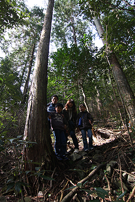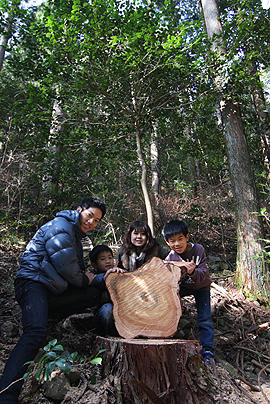 | この桧を切り倒します。ご家族で記念撮影です。 |
