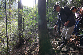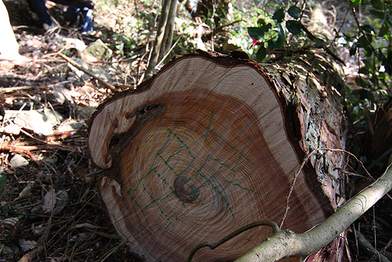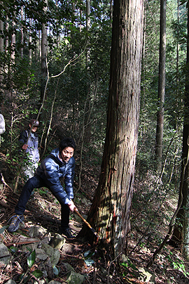 | 2010年春、仲南の森で大黒柱伐採イベントを行いました。 讃岐舎を計画中のMさんご家族の大黒柱になる桧を伐採しました。樹齢は80年超、目の詰まった良質な桧です。3月14日ホワイトデーのこと、新月伐採に対抗して「ホワイトデー伐採」です。大黒柱を伐ったご家族は今回で34組目になりました。 |