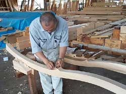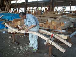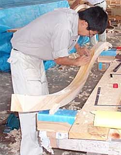 茨垂木(いばらだるき)を出丸鉋(でまるがんな)で削る山口棟梁。 |