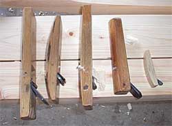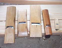 曲面を削る鉋(かんな)各種。 最も右側の小さな反り鉋は既製品。その他は棟梁が自らの好みに合わせて曲面を削って作ったもの。 |
